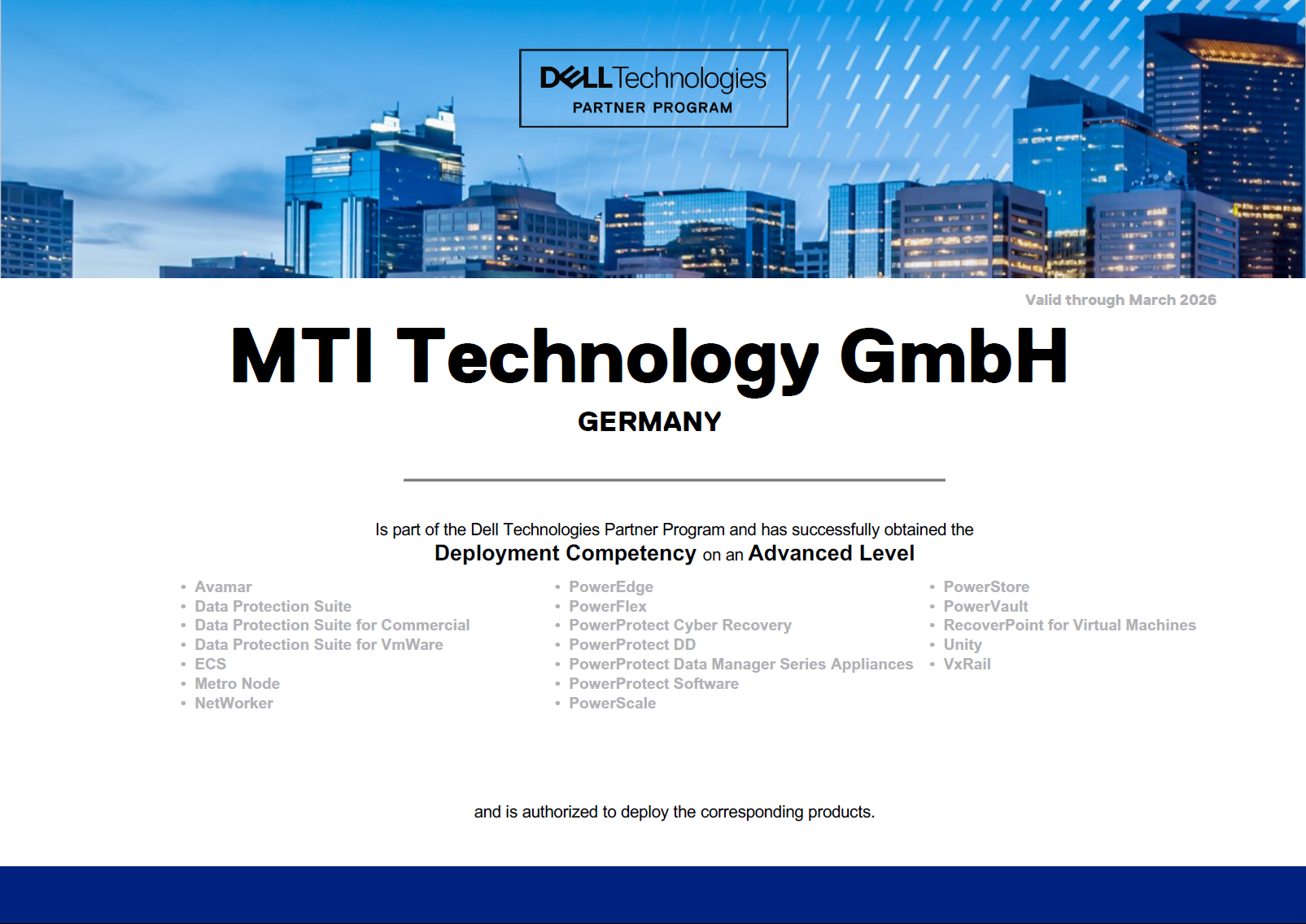 Zusätzlich wurde MTI für 2025 als einziger Dell Advanced Support Partner in Deutschland im Bereich Storage sowie als Advanced Support Partner im Bereich Backup ausgezeichnet. Auch im Bereich Deployment verfügen wir über die offizielle Dell Advanced Deployment Competency.